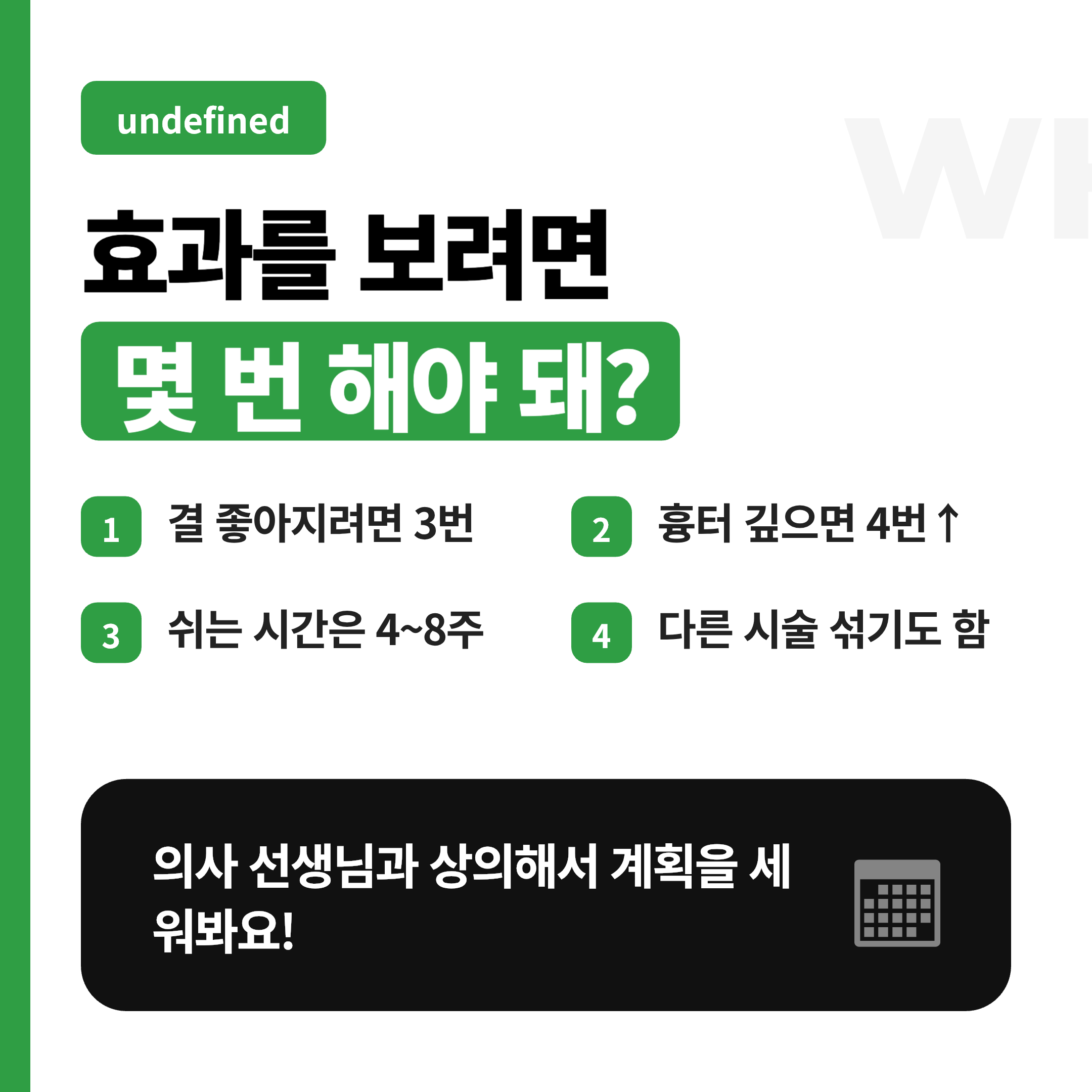 - 권장 횟수 피부결 목적은 보통 3회 전후, 흉터 목적은 4회 이상을 계획하는 경우가 많아요