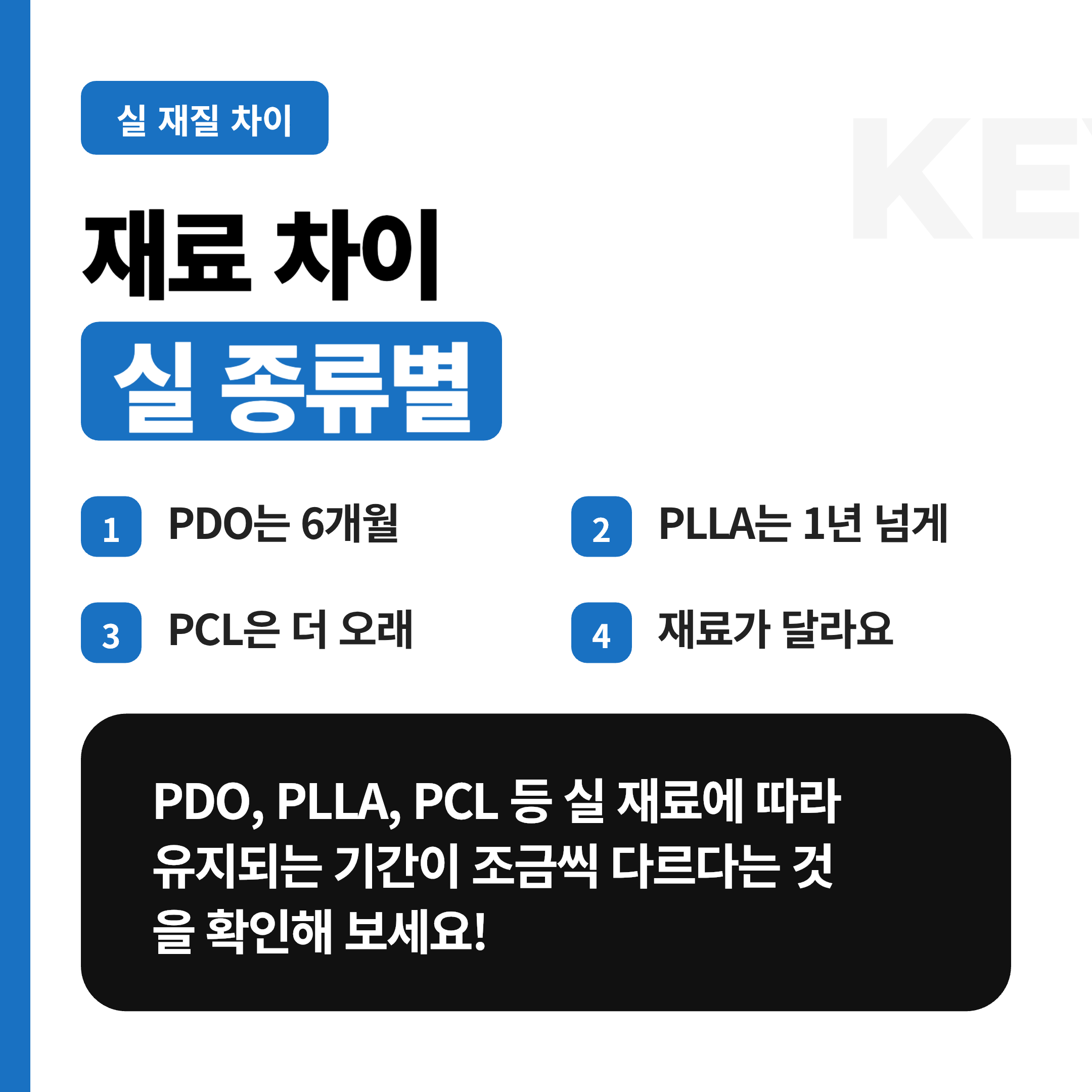 PDO는 흡수가 비교적 빠른 편으로 알려져 있고, PLLA와 PCL은 더 긴 분해 기간이 안내되는 경우가 많아요. 제품 정보와 의료 정보에서 이런 차이를 기준으로 설명하는 자료들이 있어요.